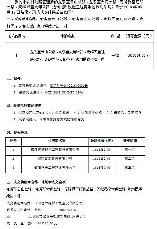 龍溪至云山公路、龍溪至大甸公路、無峰界至紅聯公路、無峰界至大甸公路 邊溝提質改造工程競爭性談判成交結果公告