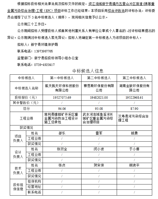 資江流域新寧縣境內(nèi)五里山片區(qū)廢渣(銻等重金屬污染綜合治理)工程(EPC) 招標(biāo)投標(biāo)信息公示表