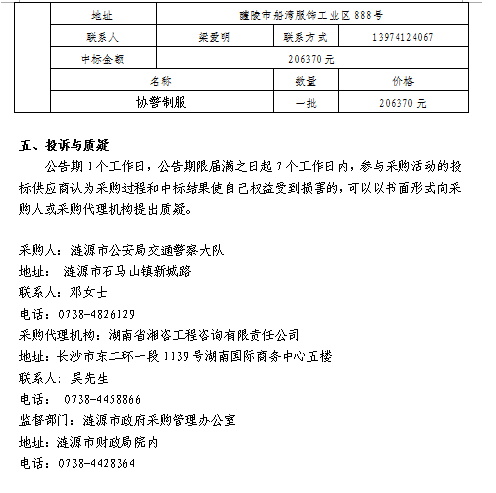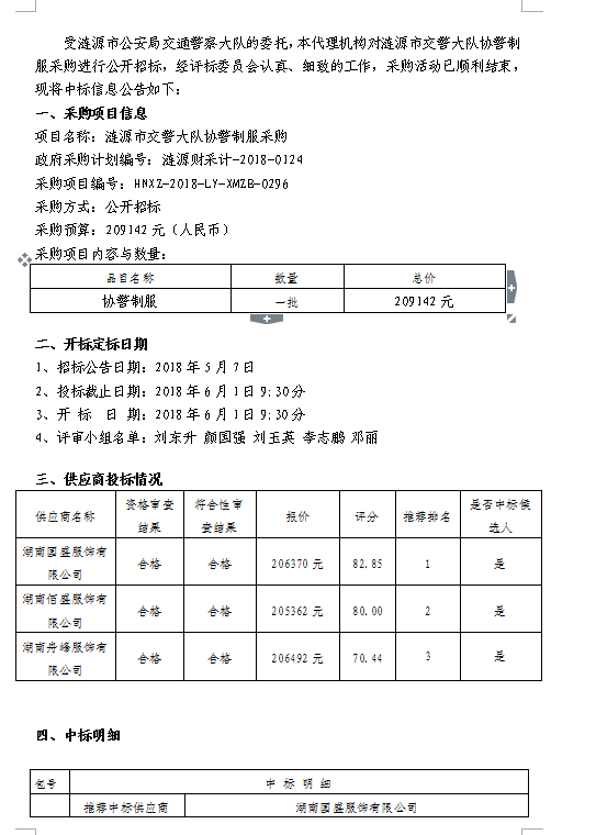 漣源市交警大隊協警制服采購中標結果公告