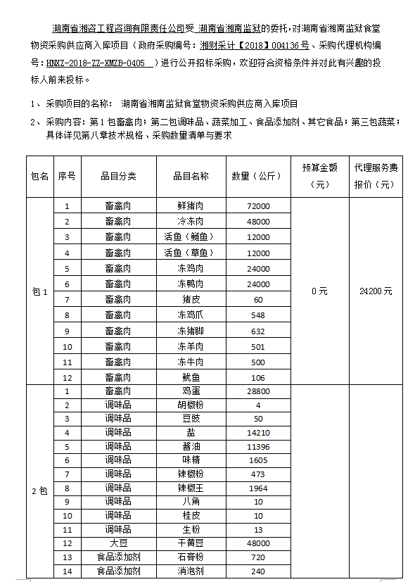 湘南監獄2018年6月至2019年5月湘南監獄犯人食堂生活物資采購員項目入圍采購公開招標公告