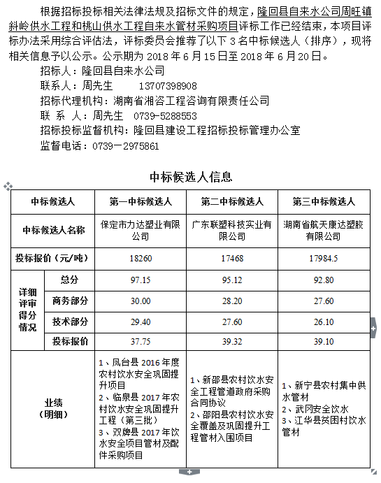 隆回縣自來水公司周旺鎮(zhèn)斜嶺供水工程和桃山供水工程自來水管材采購(gòu)項(xiàng)目招標(biāo)投標(biāo)信息公示表