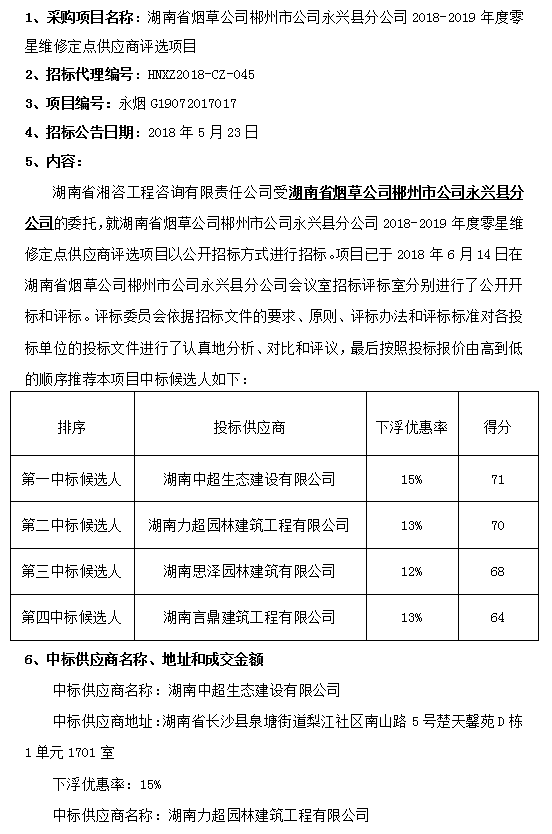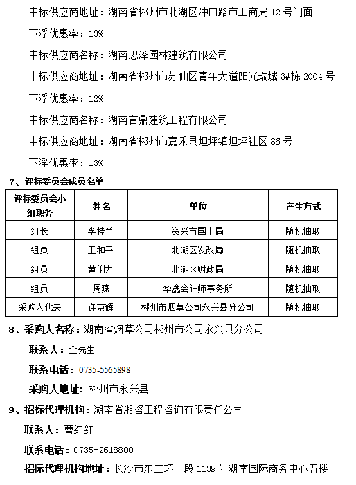 湖南省煙草公司郴州市公司永興縣分公司2018-2019年度零星維修定點供應商評選項目結果公示