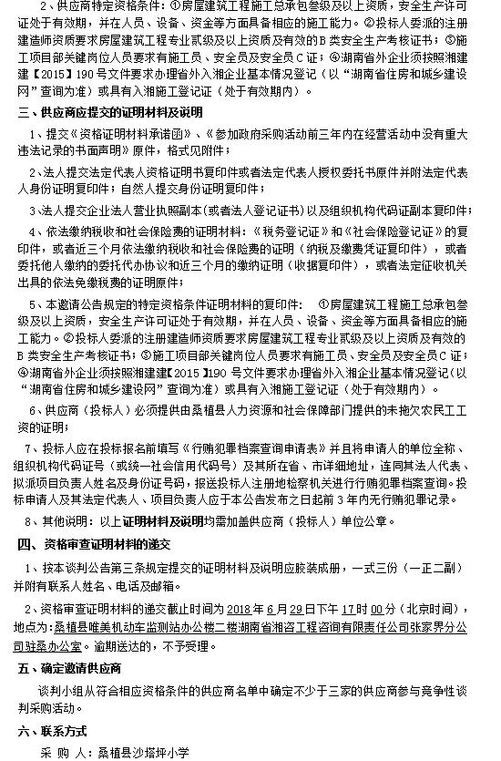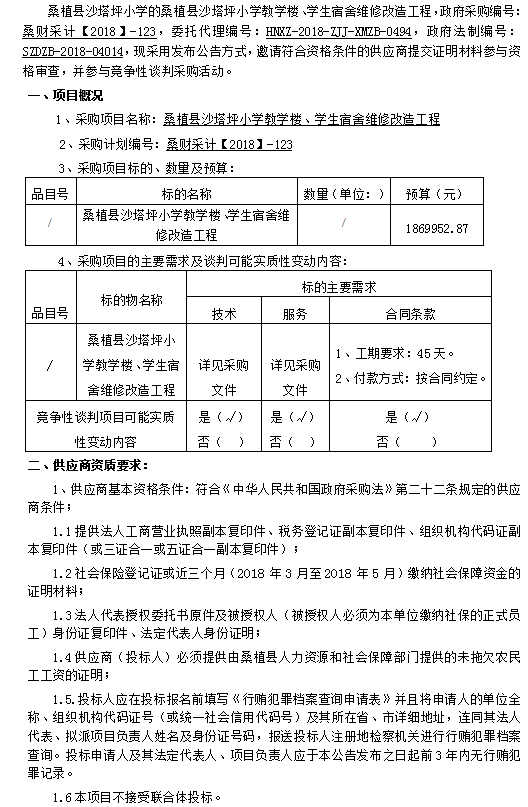 桑植縣沙塔坪小學教學樓、學生宿舍維修改造工程 談判公告