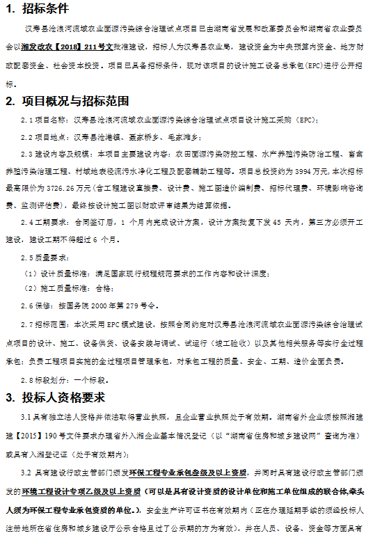 漢壽縣滄浪河流域農(nóng)業(yè)面源污染綜合治理試點(diǎn)項(xiàng)目設(shè)計(jì)施工采購 (EPC)總承包招標(biāo)公告