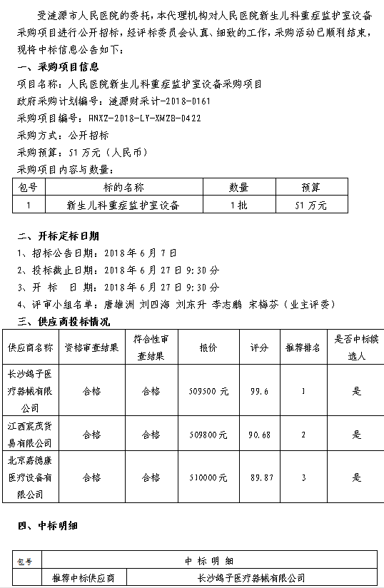人民醫(yī)院新生兒科重癥監(jiān)護(hù)室設(shè)備采購(gòu)項(xiàng)目 中標(biāo)結(jié)果公告