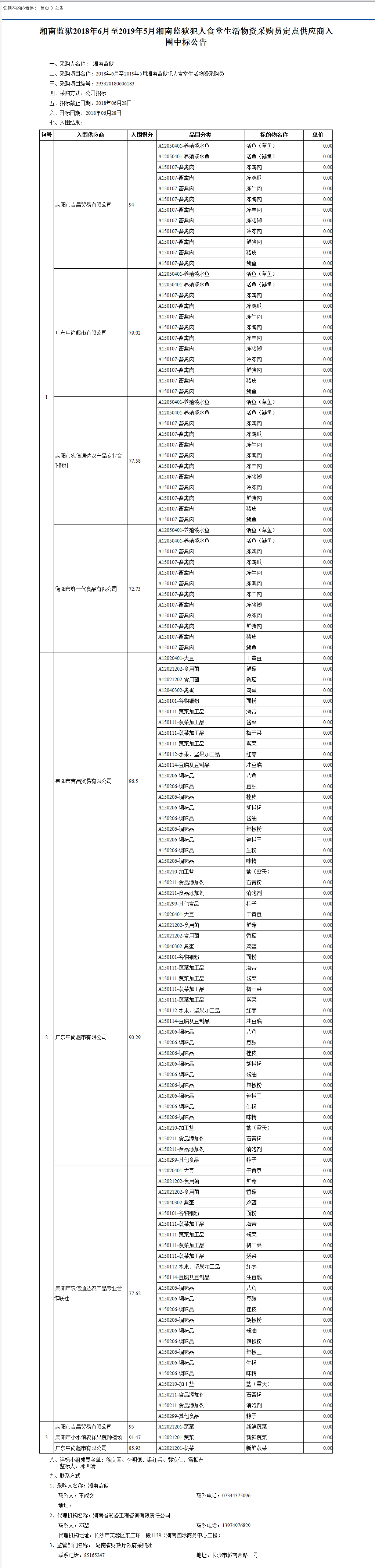 湘南監獄2018年6月至2019年5月湘南監獄犯人食堂生活物資采購員定點供應商入圍中標公告