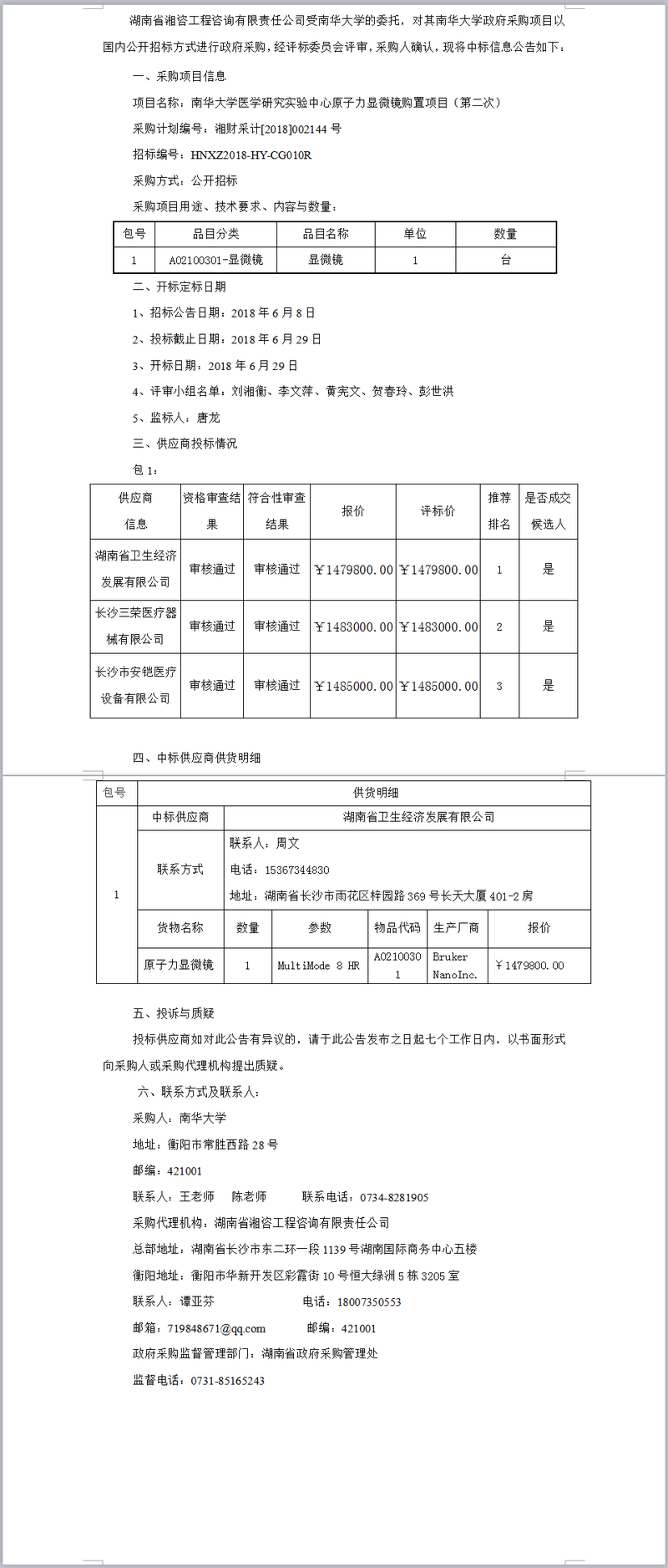 南華大學醫學研究實驗中心原子力顯微鏡購置項目(第二次)中標公告