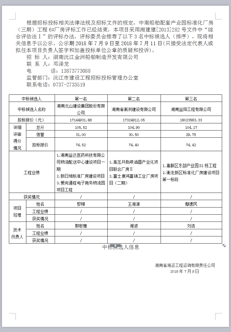 中南船舶配套產業園標準化廠房(三期)工程6#廠房中標候選人公示