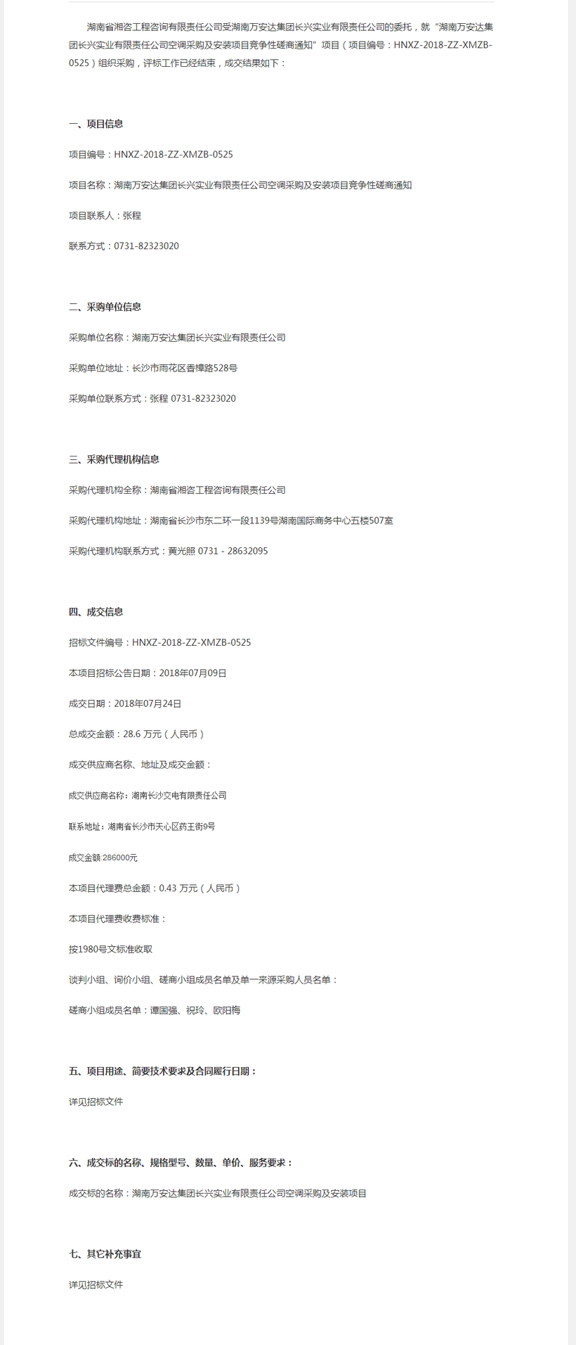 湖南萬安達集團長興實業有限責任公司空調采購及安裝項目競爭性磋商通知成交公告