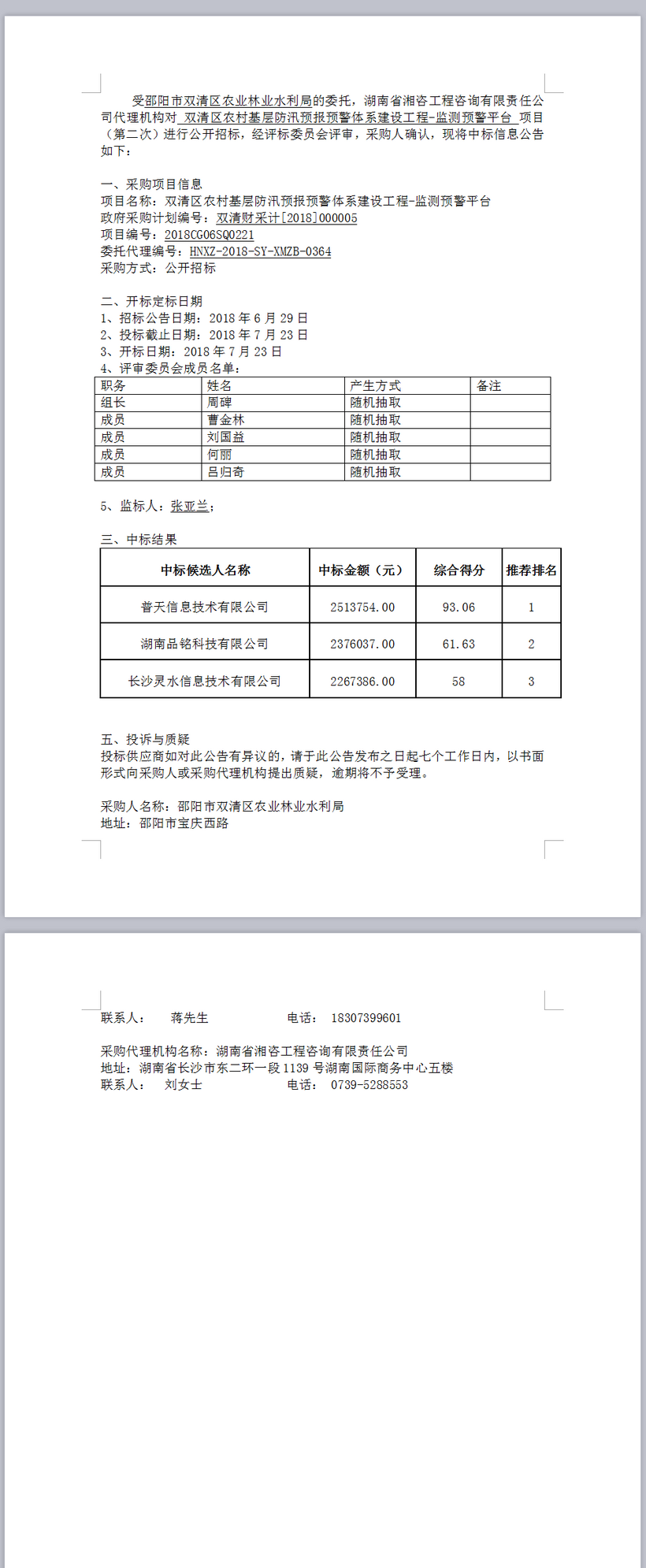雙清區農村基層防汛預報預警體系建設工程-監測預警平臺項目(第二次)成交公告