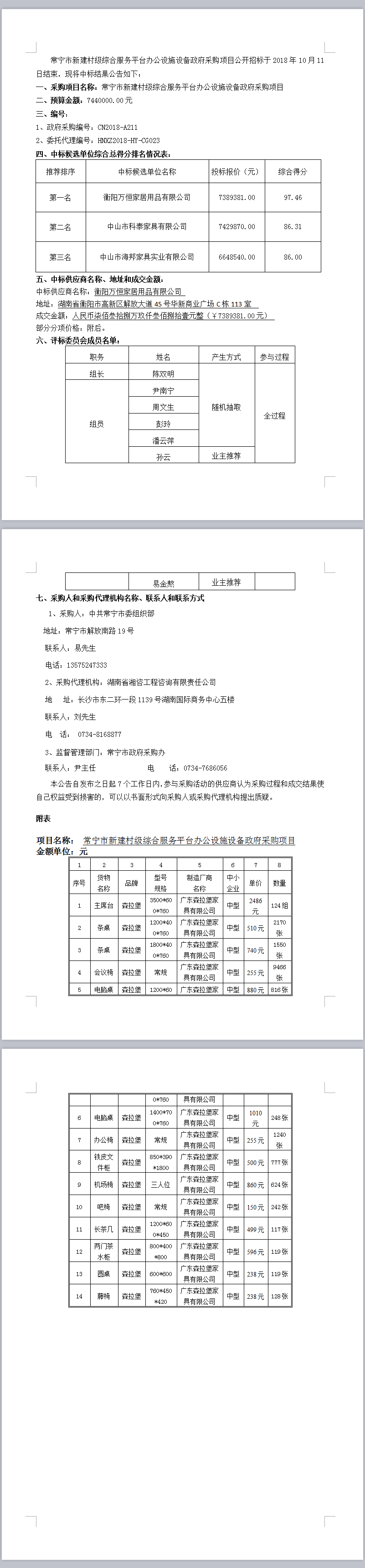 常寧市新建村級綜合服務平臺辦公設施設備政府采購項目公開招標中標公告