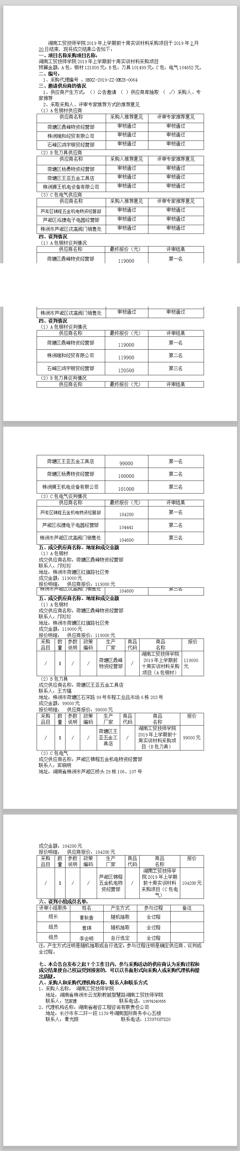 湖南工貿技師學院2019年上學期前十周實訓材料采購項目競爭性談判成交公告