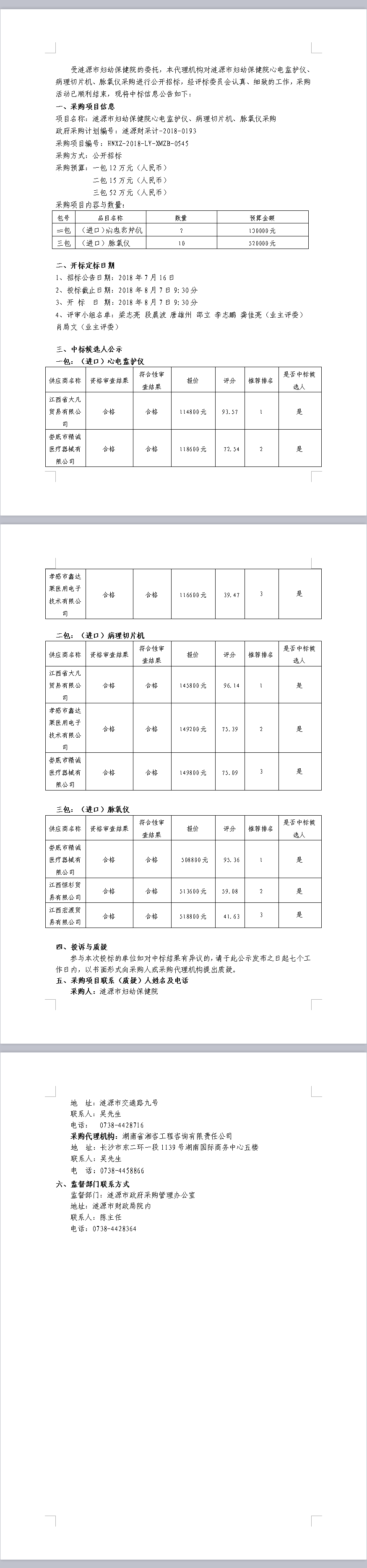 漣源市婦幼保健院心電監護儀、病理切片機、脈氧儀采購 中標結果公告