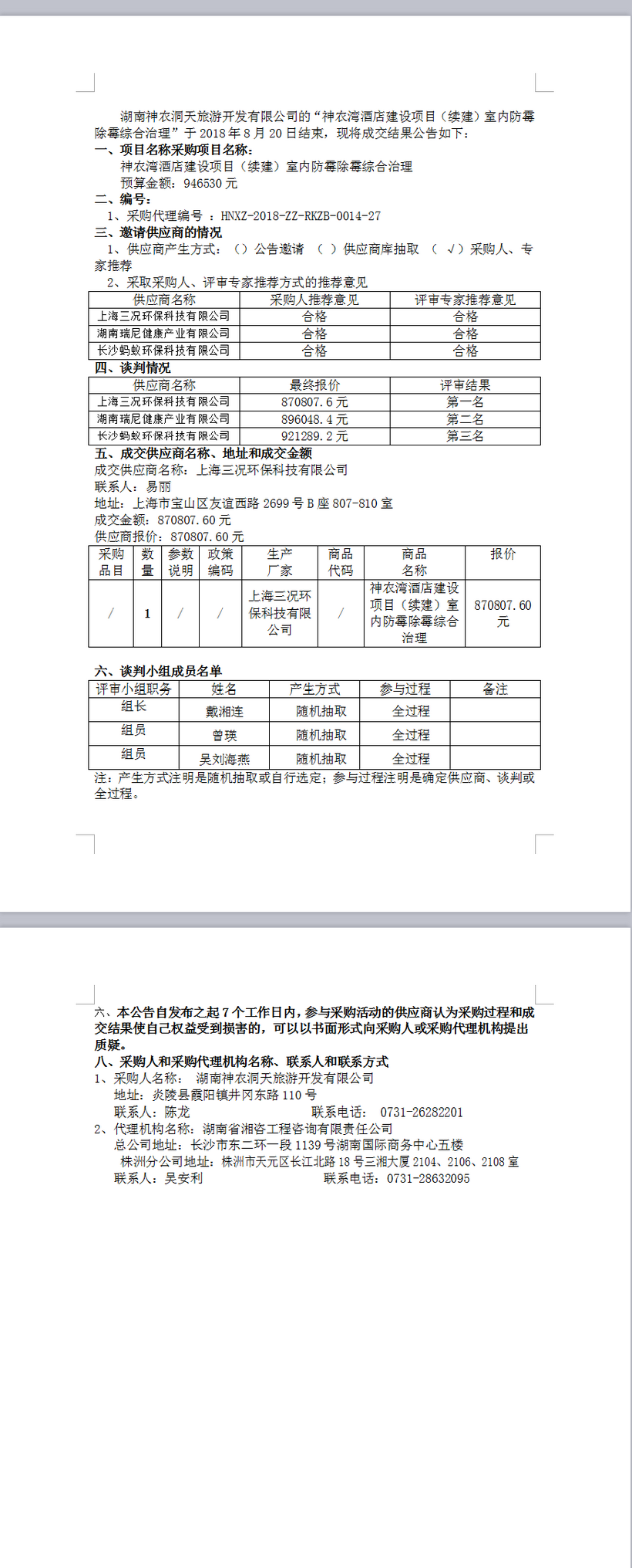 神農灣酒店建設項目(續建)室內防霉除霉綜合治理競爭性談判成交公告