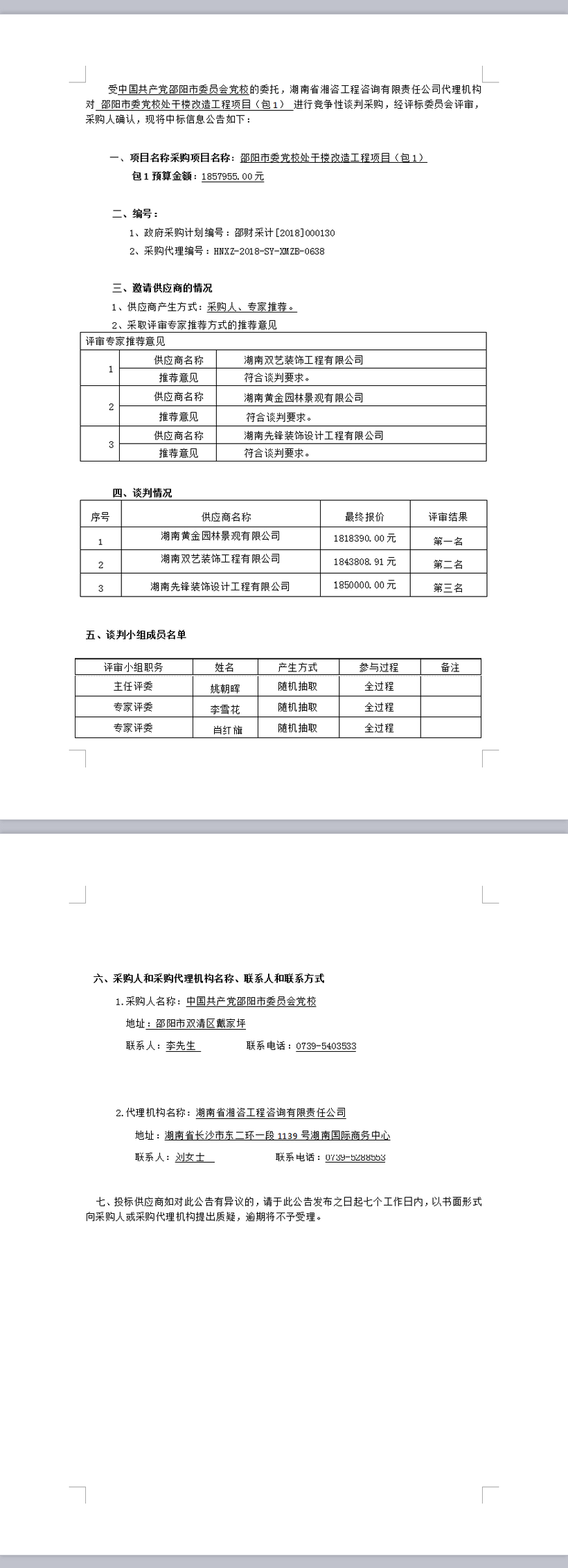 邵陽市委黨校處干樓改造工程項(xiàng)目(包1)競爭性談判成交公告