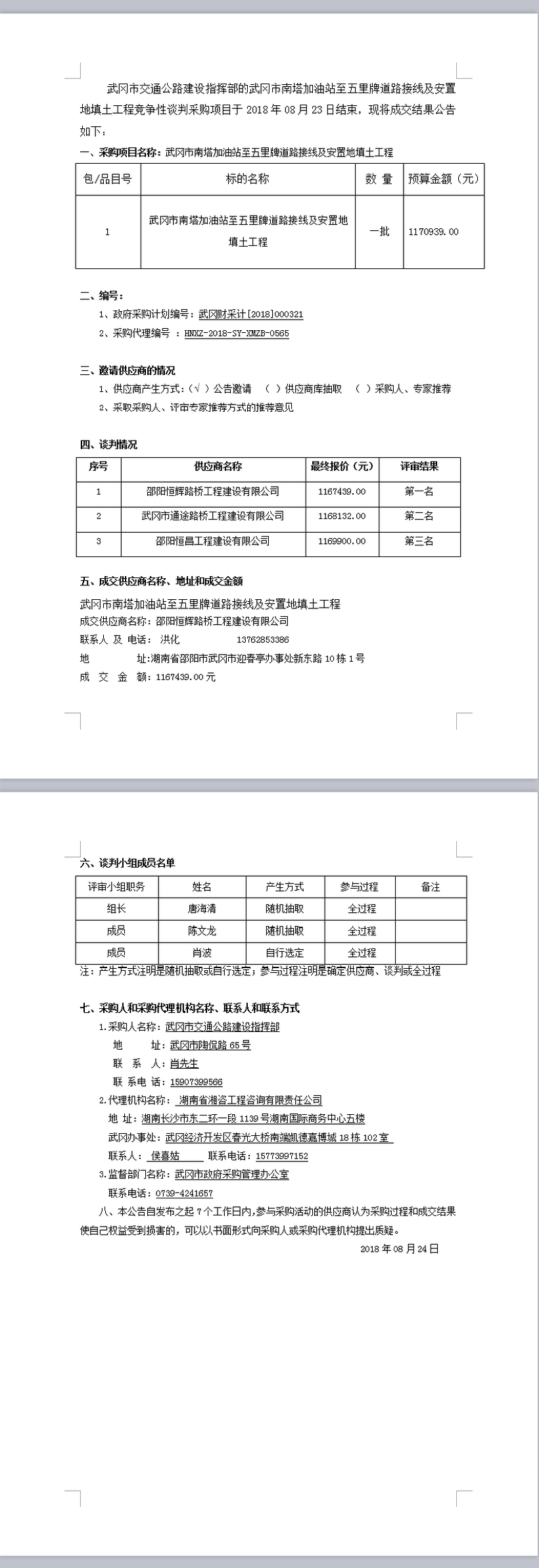 武岡市南塔加油站至五里牌道路接線及安置地填土工程競爭性談判成交結(jié)果公告