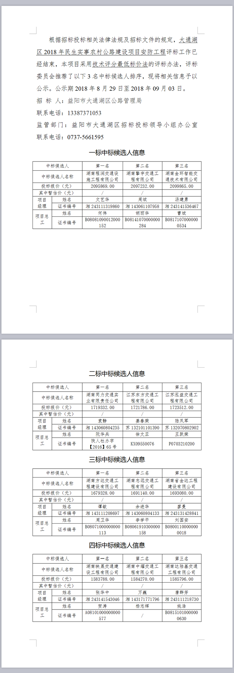 大通湖區2018年民生實事農村公路建設項目安防工程中標候選人公示