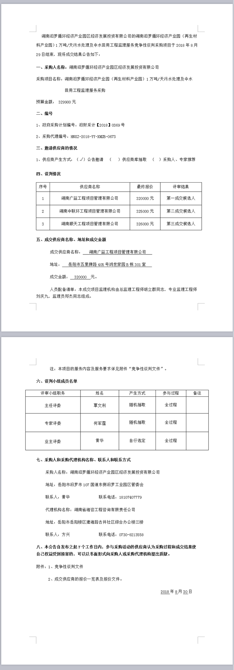 湖南汨羅循環經濟產業園(再生材料產業園)1萬噸/天污水處理及中水回用工程監理服務政府采購項目競爭性談判成交結果公告