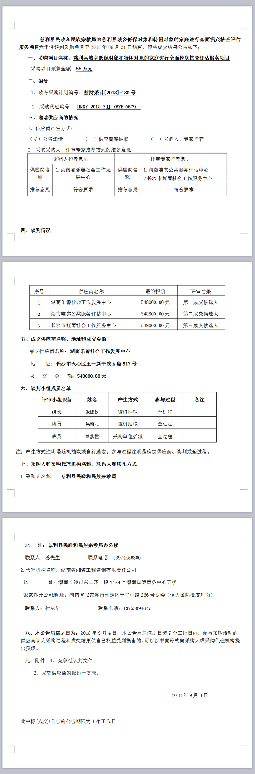慈利縣城鄉低保對象和特困對象的家庭進行全面摸底核查評估服務項目談判成交公告