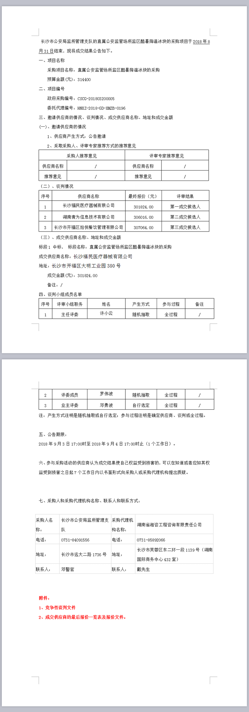 長沙市公安局監所管理支隊直屬公安監管場所監區酷暑降溫冰塊的采購結果公告