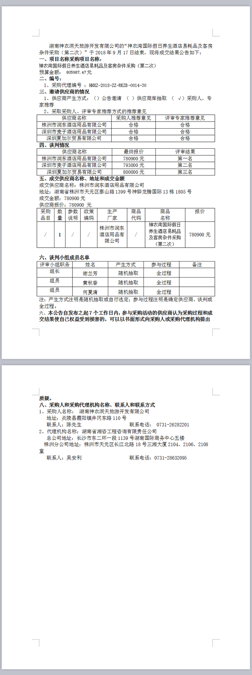 神農灣國際假日養生酒店易耗品及客房雜件采購(第二次)競爭性談判成交公告