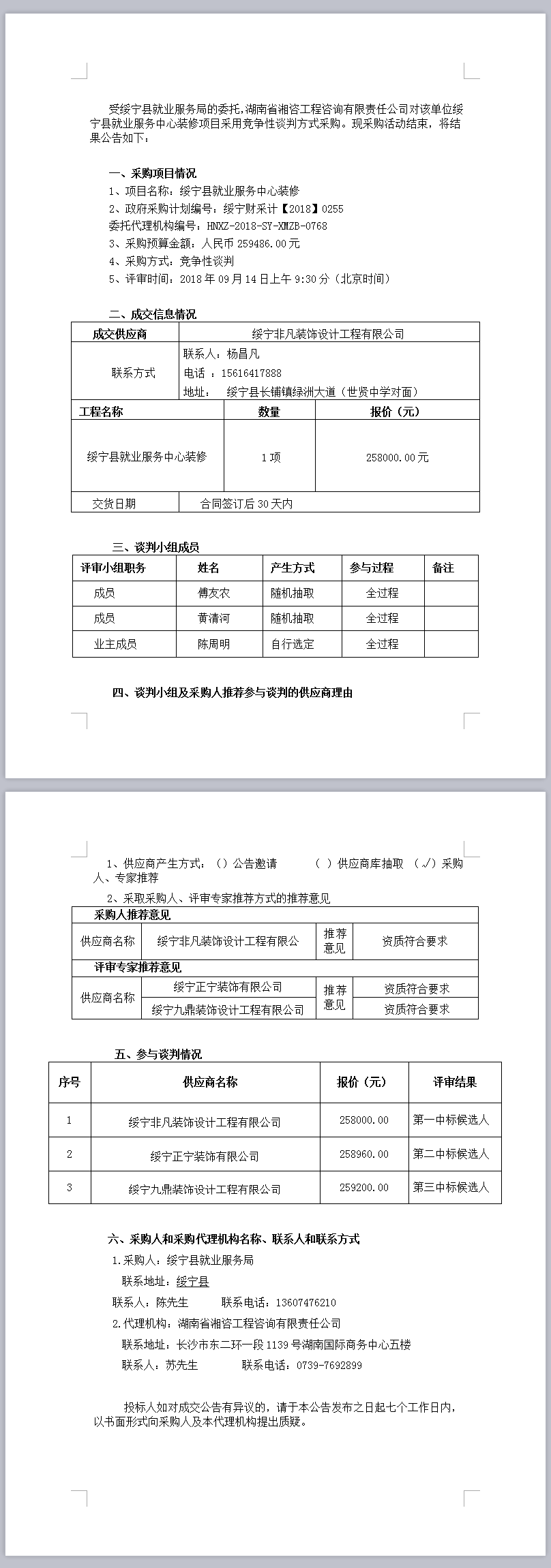 綏寧縣就業服務中心裝修談判成交公告