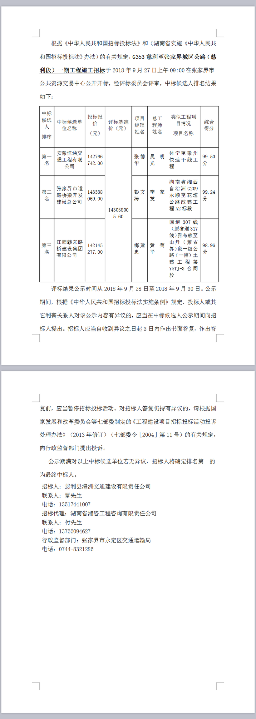 G353慈利至張家界城區(qū)公路(慈利段)一期工程施工招標(biāo)中標(biāo)候選單位公示