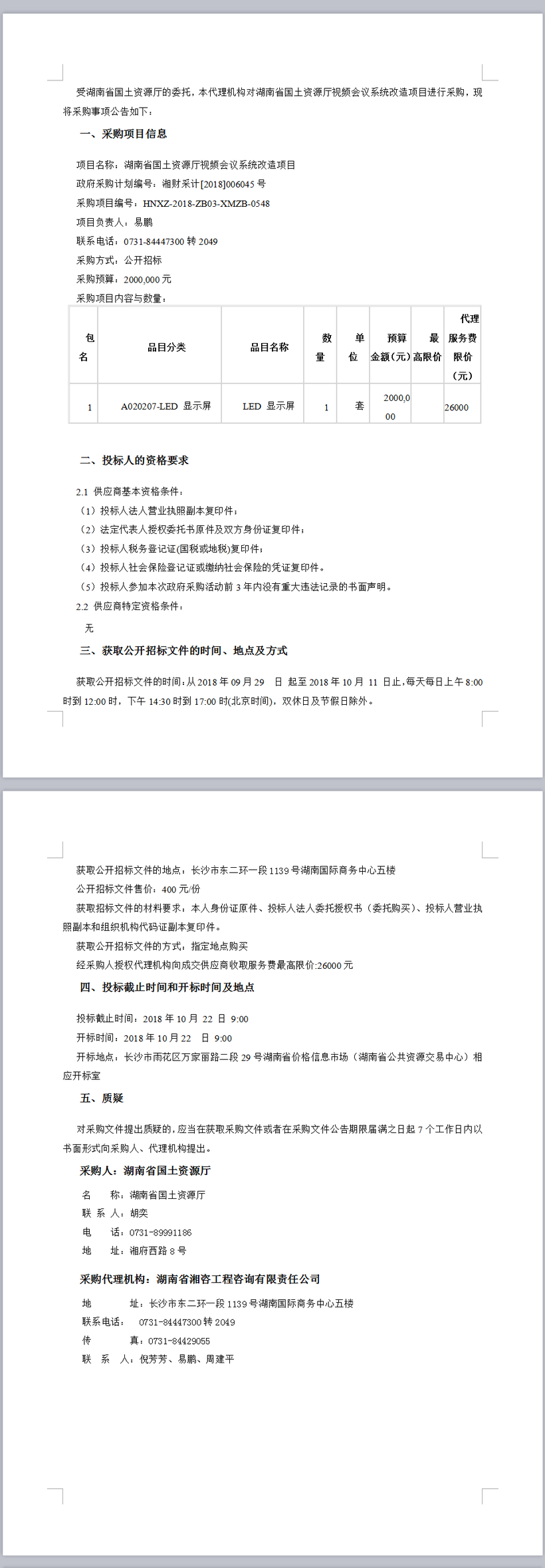 湖南省國土資源廳視頻會(huì)議系統(tǒng)改造項(xiàng)目招標(biāo)公告