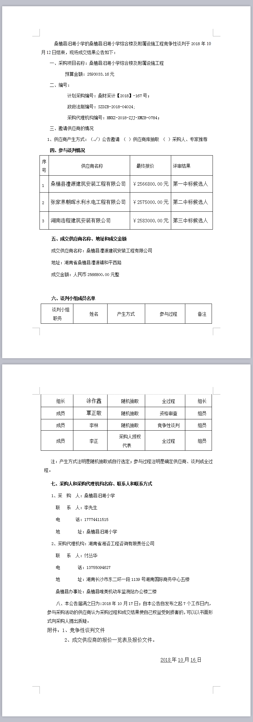 桑植縣汨湖小學綜合樓及附屬設施工程談判成交公告