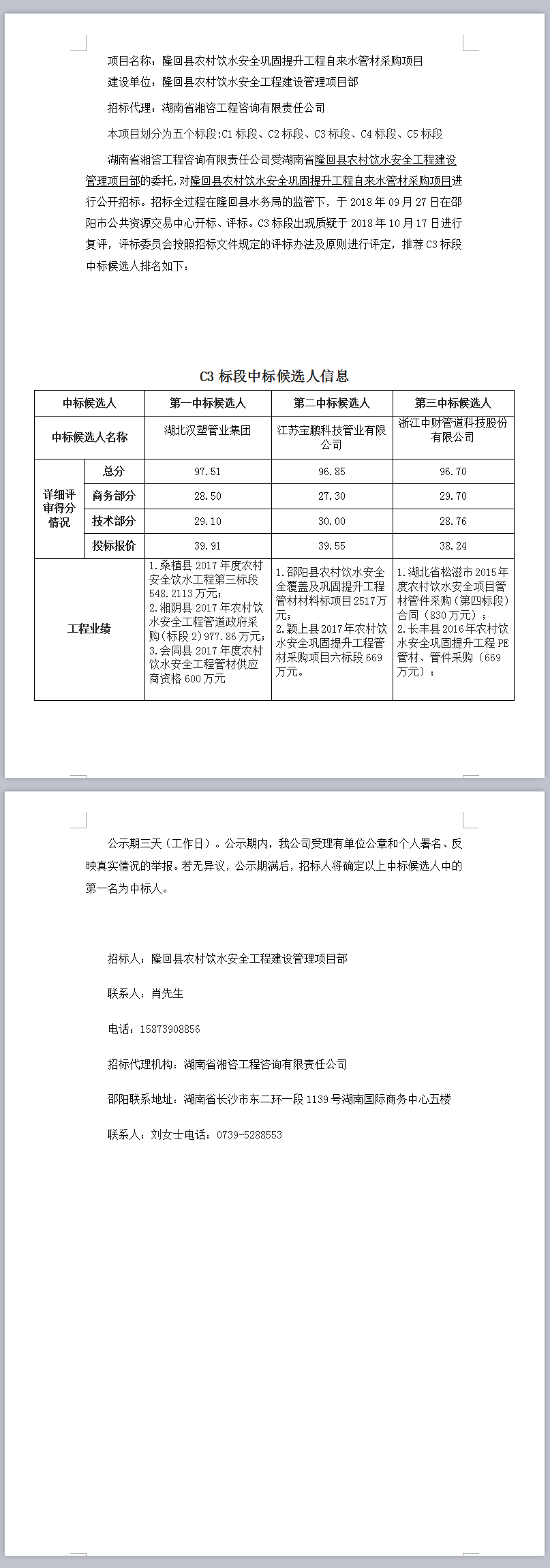 隆回縣農村飲水安全鞏固提升工程自來水管材采購項目招標投標信息公示表(C3標段復評)
