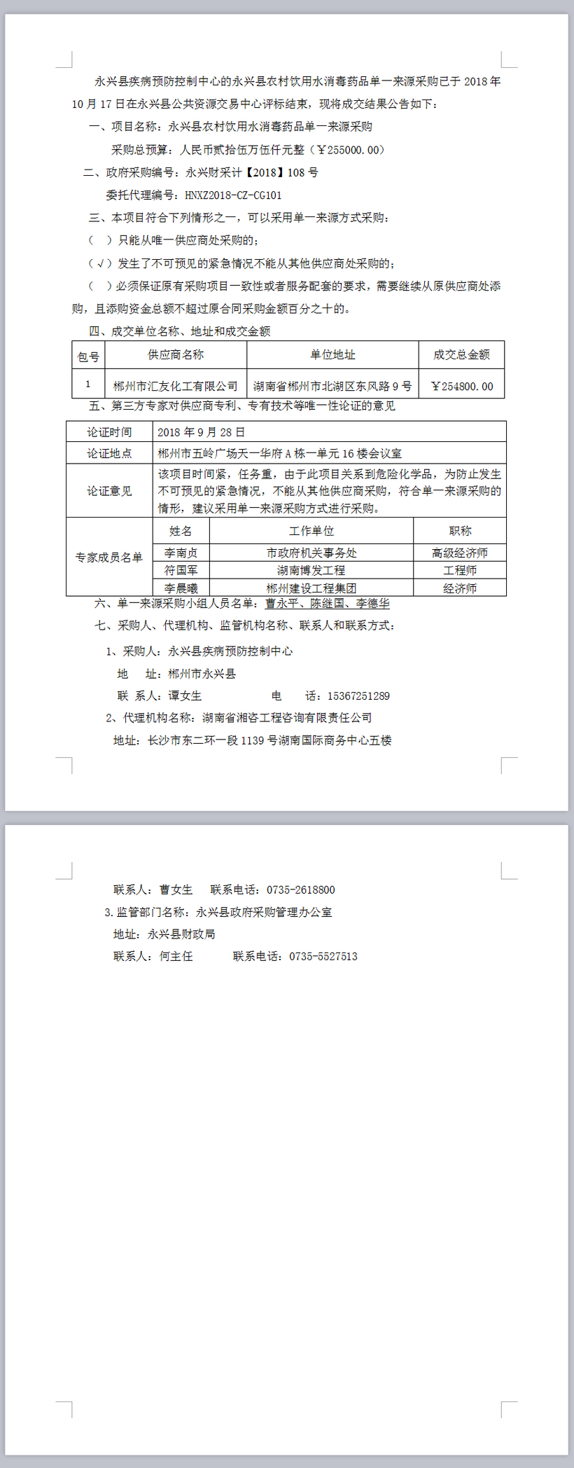 永興縣農(nóng)村飲用水消毒藥品單一來(lái)源采購(gòu)成交公告