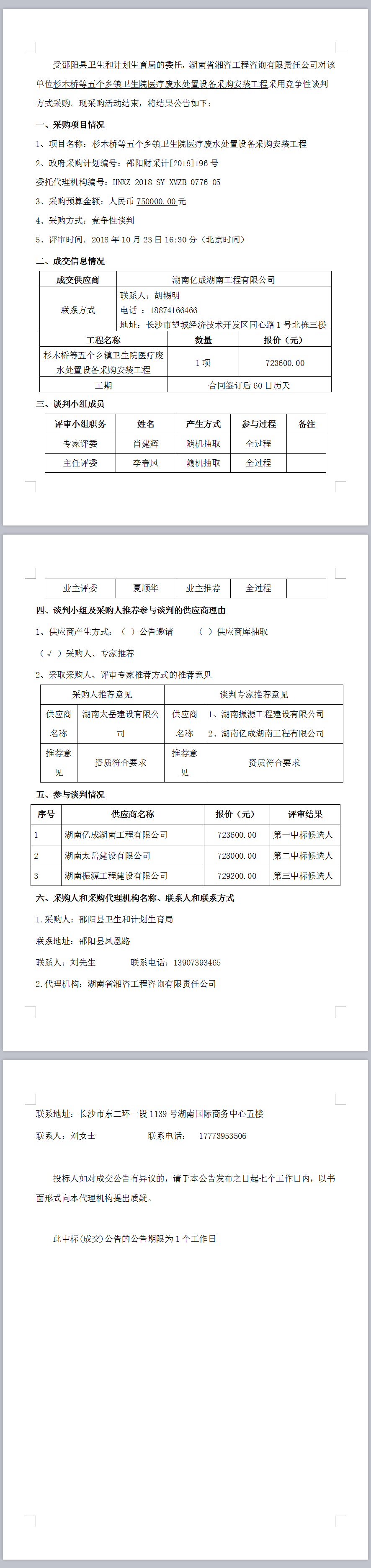 杉木橋等五個鄉鎮衛生院醫療廢水處置設備采購安裝工程談判成交公告