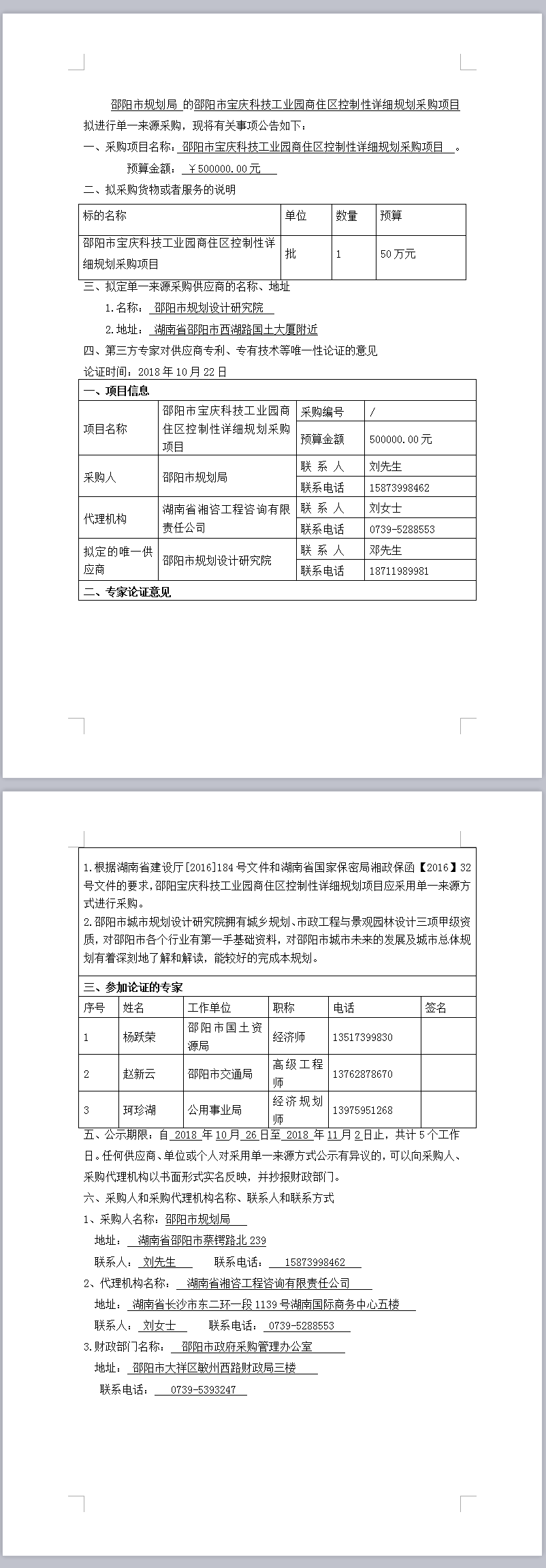 邵陽市寶慶科技工業園商住區控制性詳細規劃采購項目 單一來源論證公示