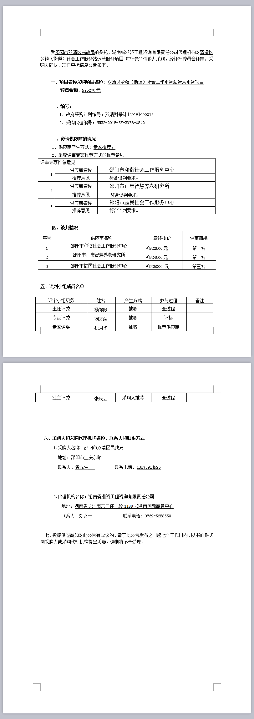湖南省雙清區鄉鎮(街道)社會工作服務站運營服務項目競爭性談判成交公告