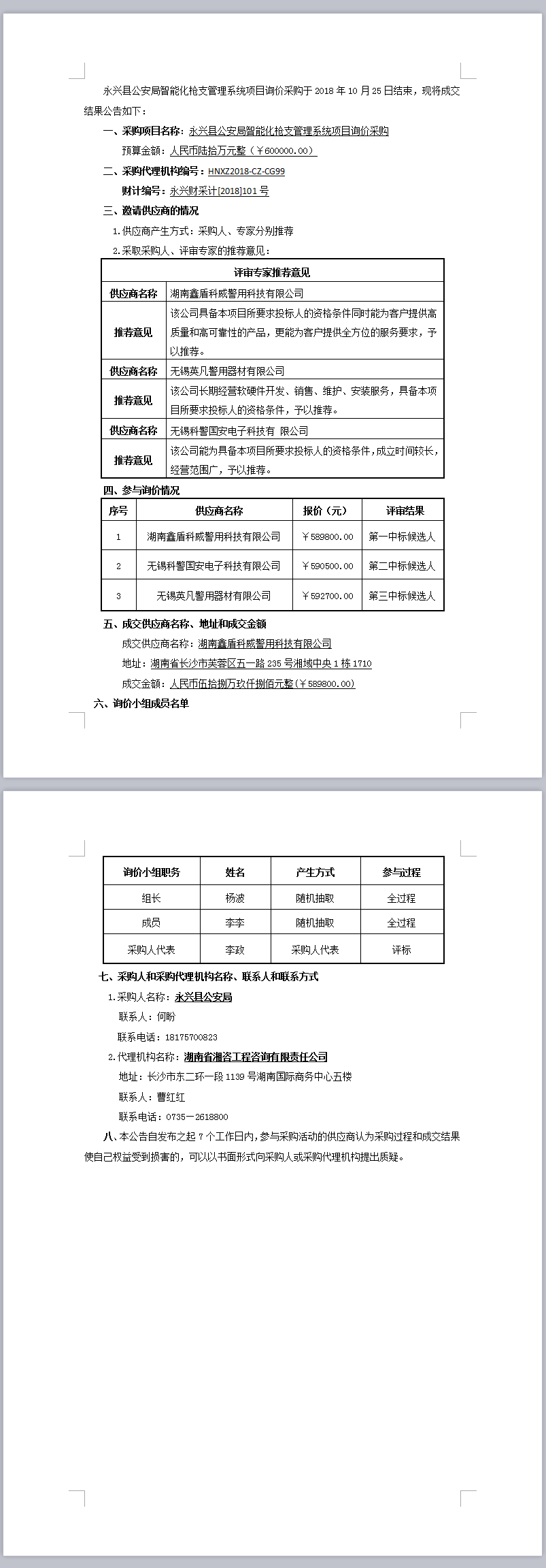 永興縣公安局智能化槍支管理系統項目詢價采購成交結果公告