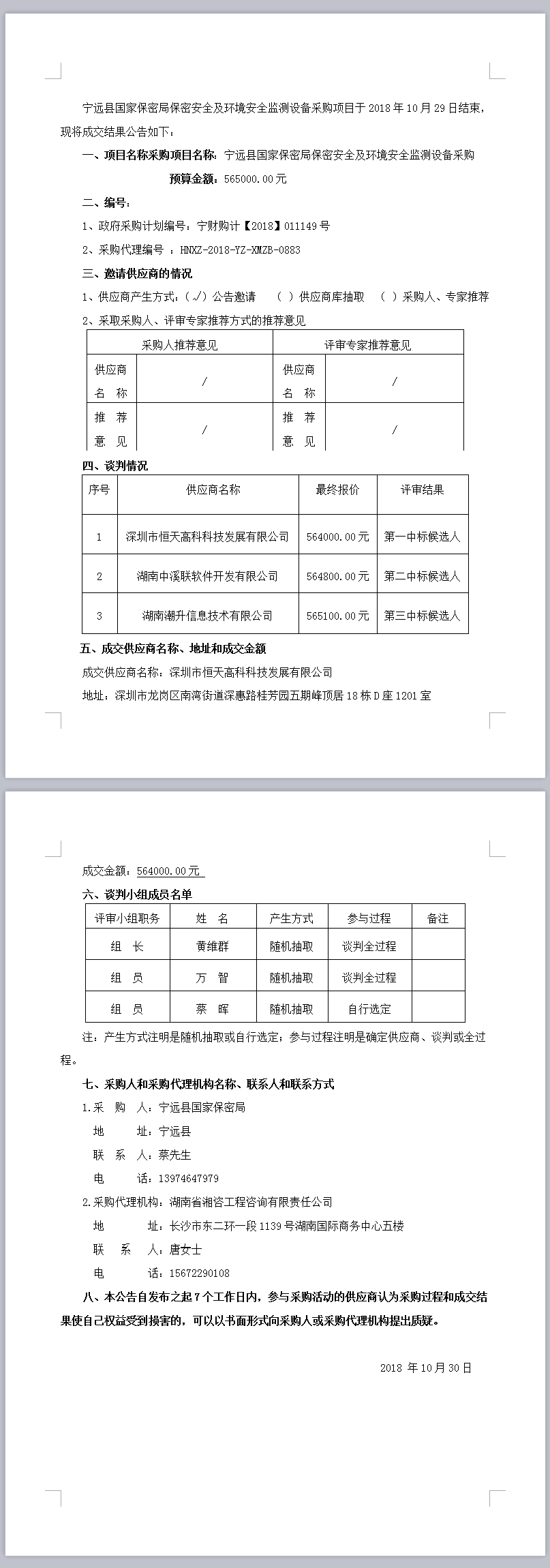 寧遠縣國家保密局保密安全及環境安全監測設備采購項目 競爭性談判成交公告