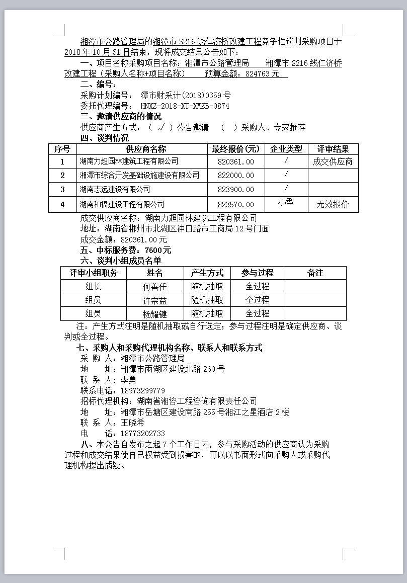 湘潭市S216線仁濟橋改建工程競爭性談判成交結果公告