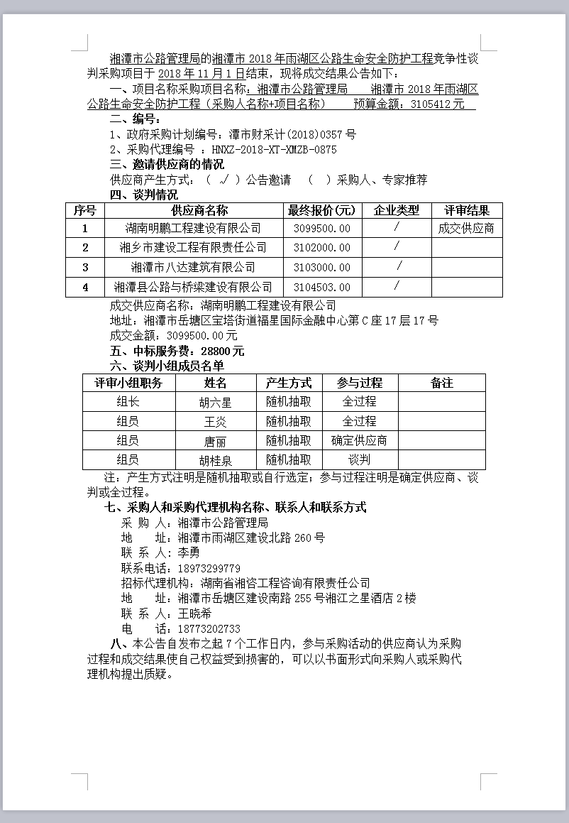 湘潭市2018年雨湖區公路生命安全防護工程競爭性談判成交結果公告