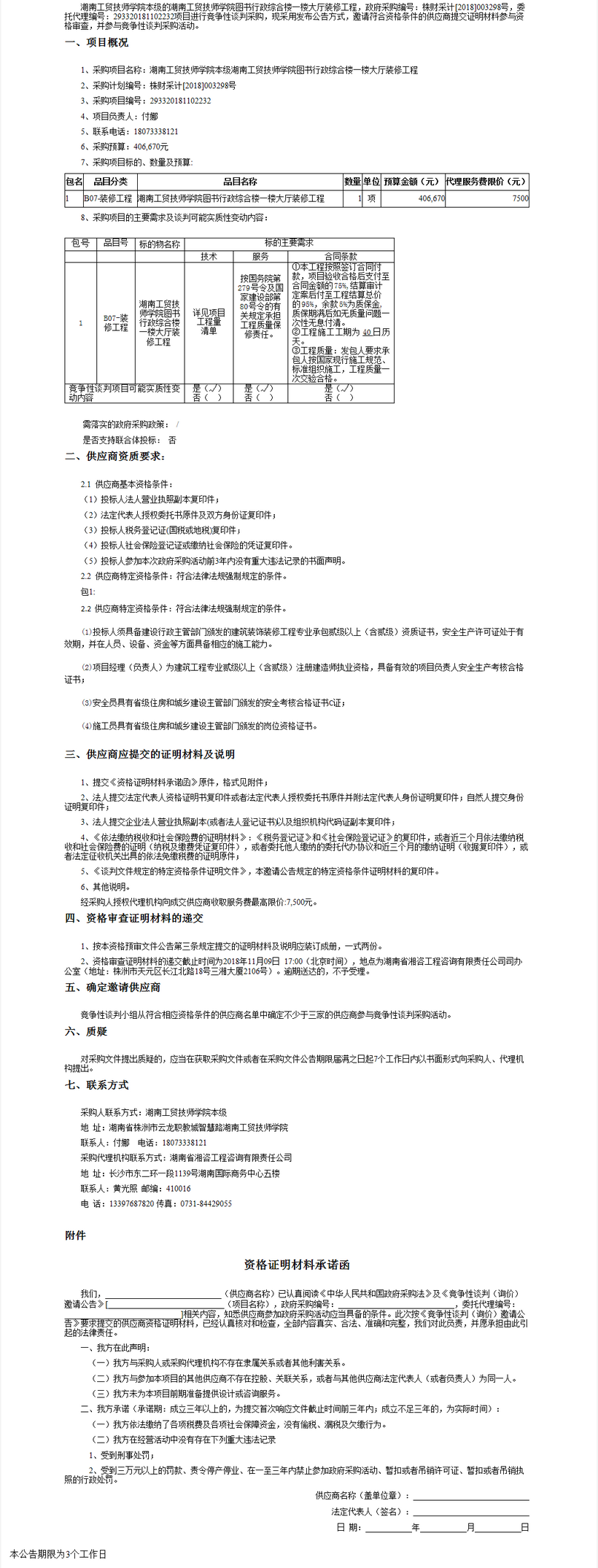 湖南工貿技師學院圖書行政綜合樓一樓大廳裝修工程競爭性談判邀請公告