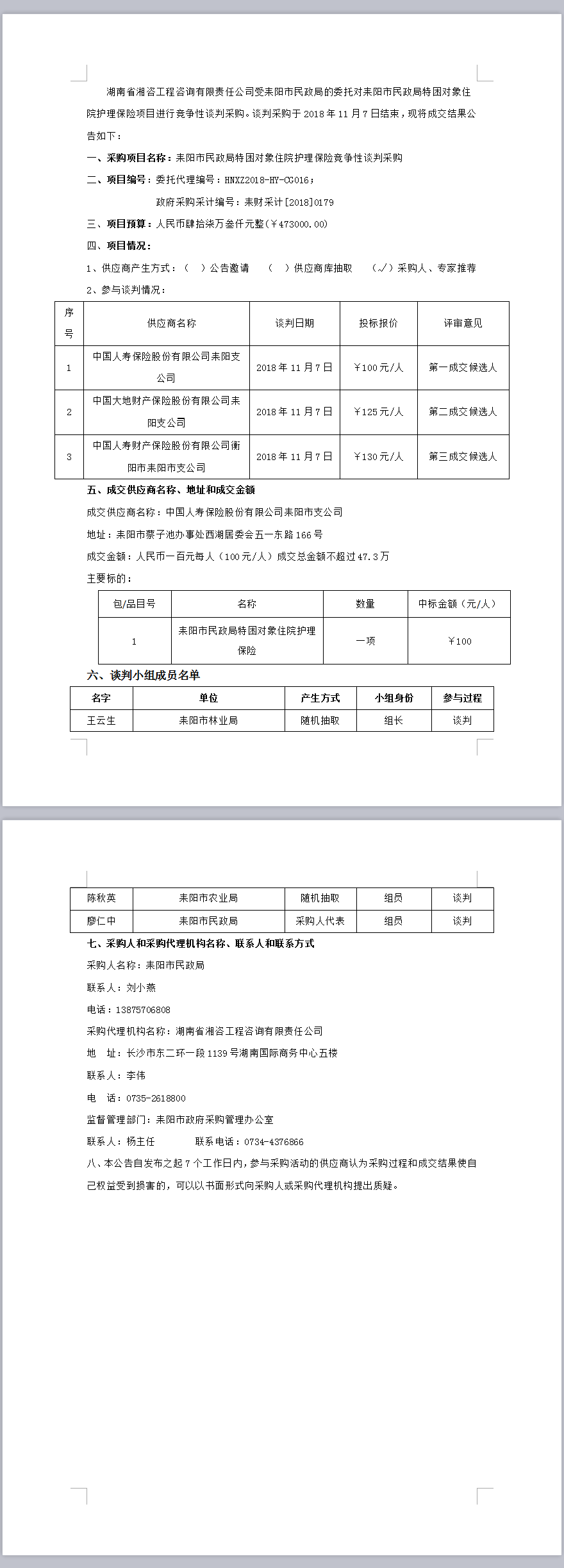 耒陽市民政局特困對象住院護理保險競爭性談判采購成交公告