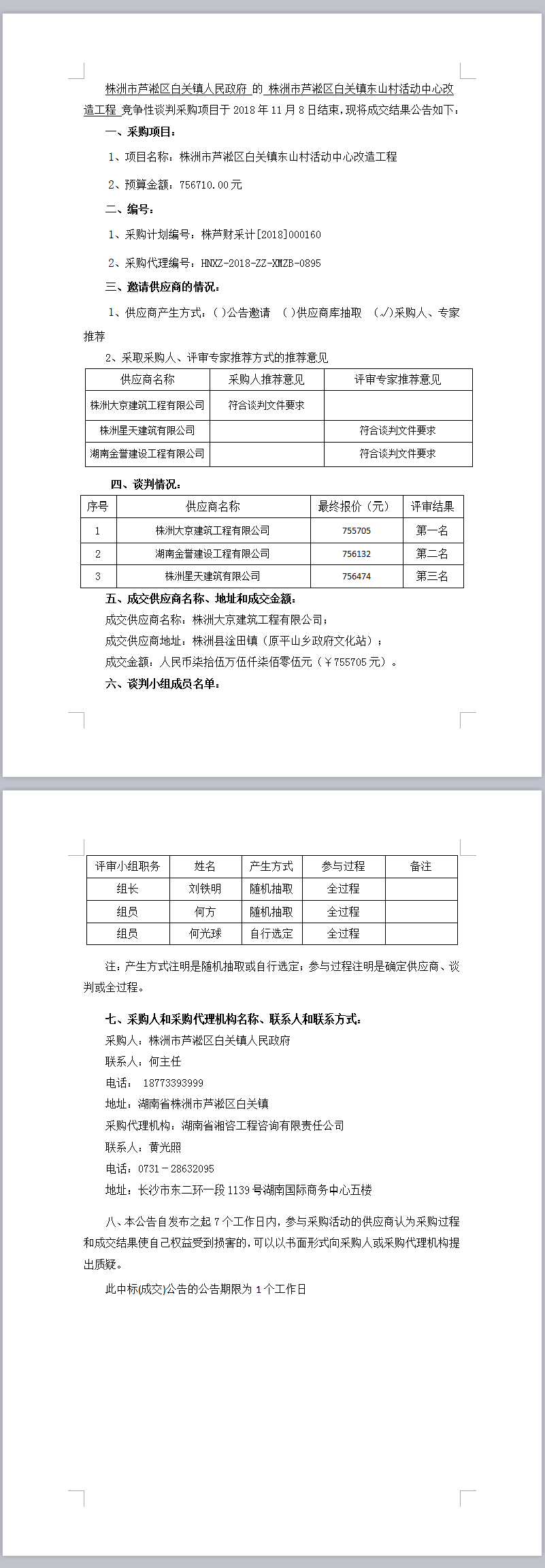 株洲市蘆淞區白關鎮東山村活動中心改造工程談判成交公告