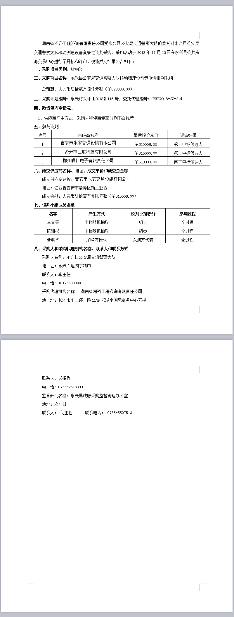 永興縣公安局交通警察大隊移動測速設(shè)備競爭性談判采購成交公告