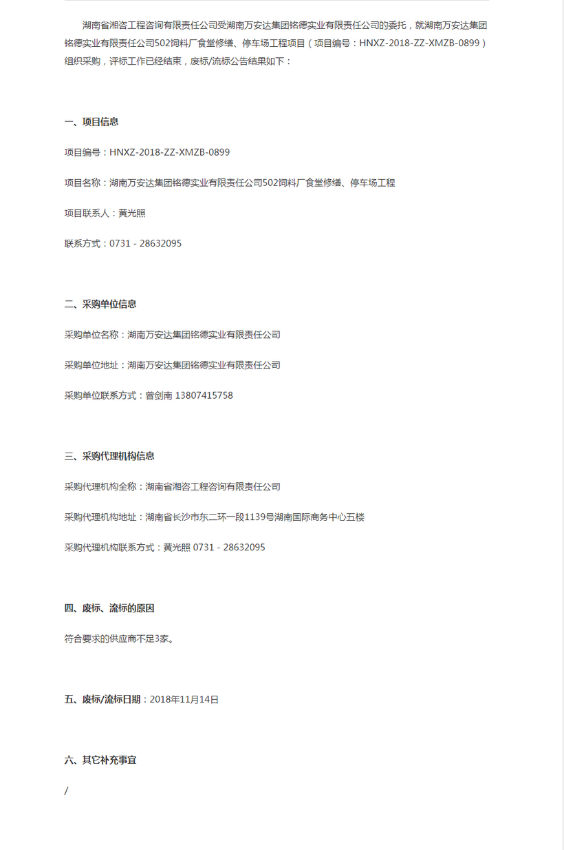 湖南萬安達(dá)集團(tuán)銘德實(shí)業(yè)有限責(zé)任公司502飼料廠食堂修繕、停車場工程廢標(biāo)公告/流標(biāo)公告