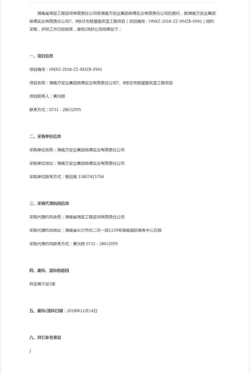 湖南萬安達集團銘德實業有限責任公司7、8棟住宅樓屋面改造工程項目廢標公告/流標公告
