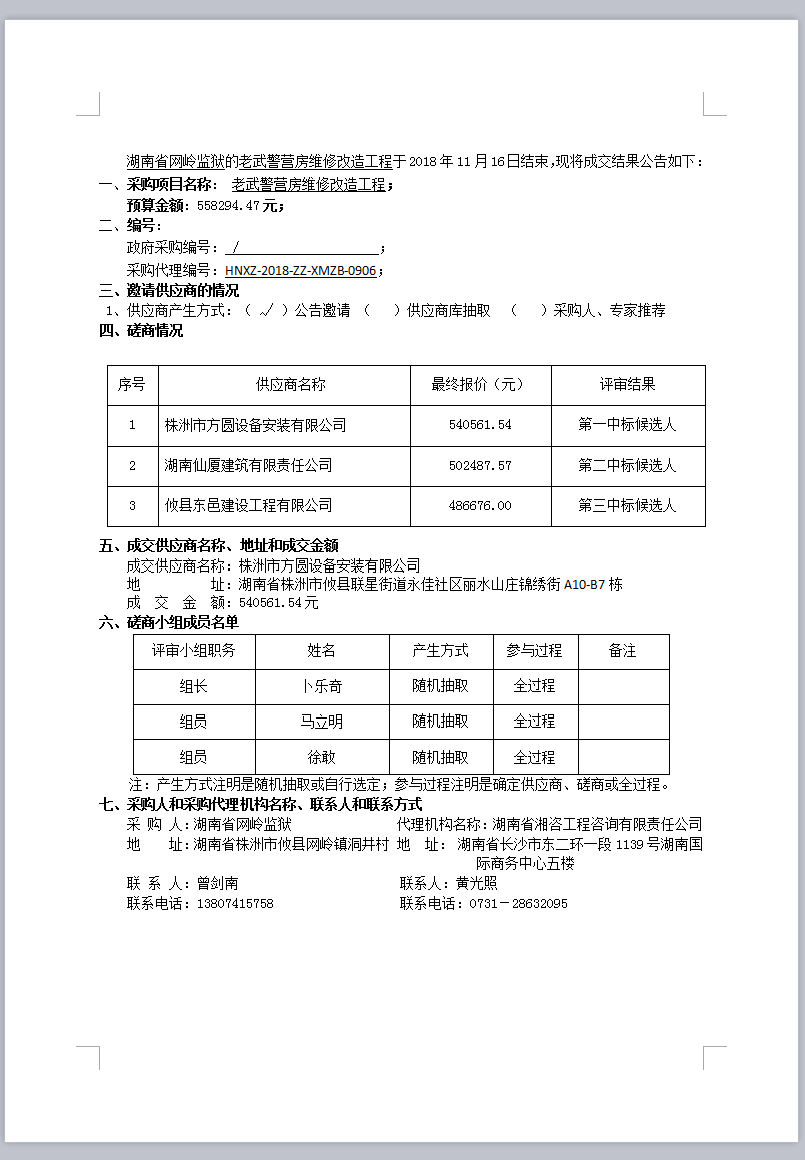 老武警營房維修改造工程成交結果公告