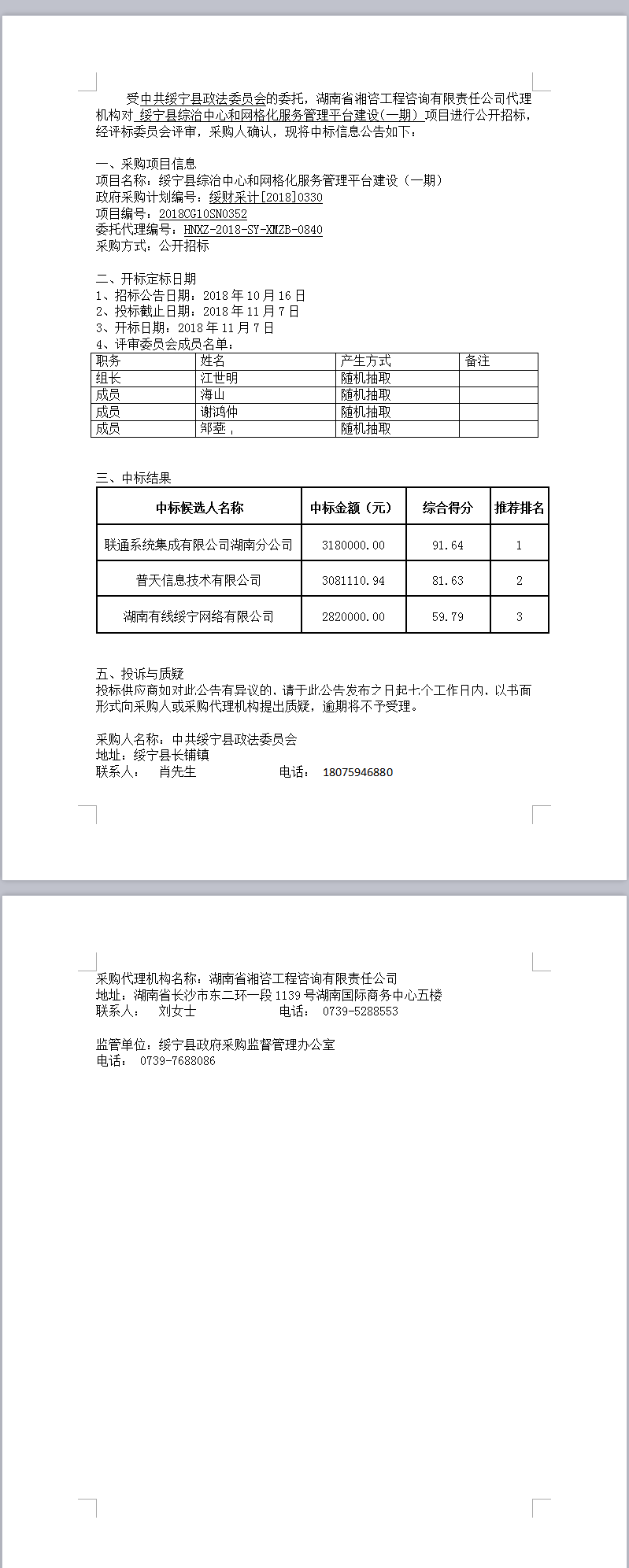 綏寧縣綜治中心和網格化服務管理平臺建設(一期)成交公告