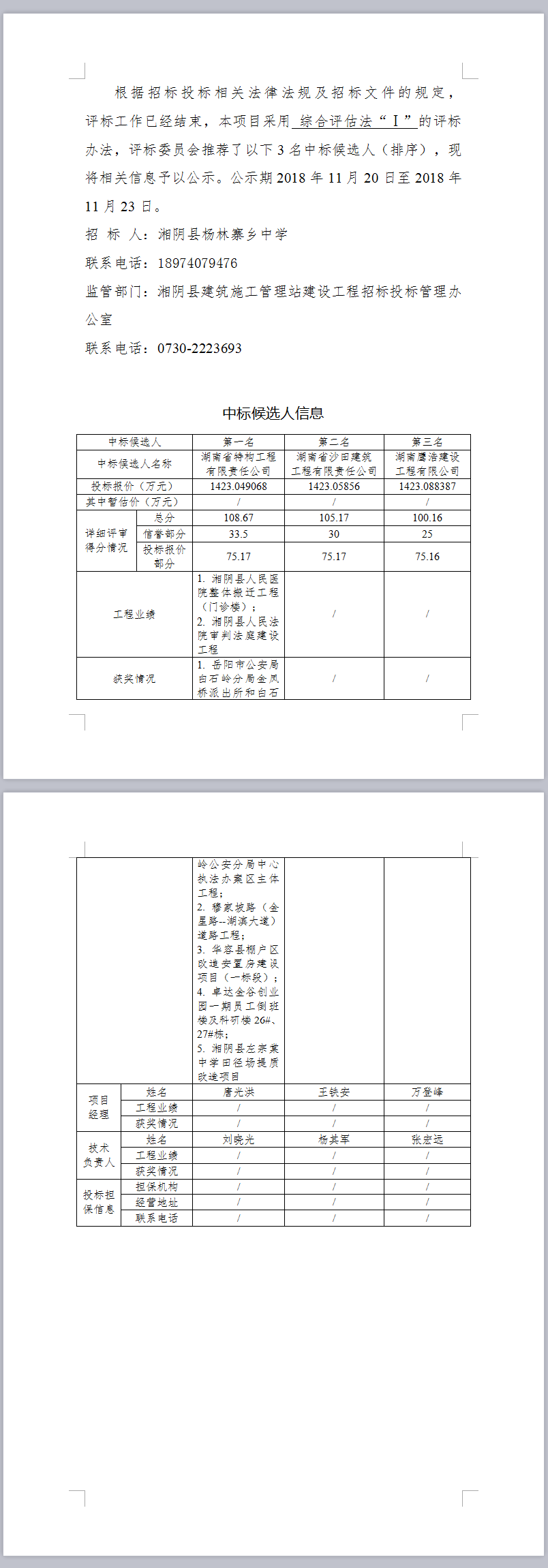 湘陰縣楊林寨中學改擴建項目施工招標投標信息公示表