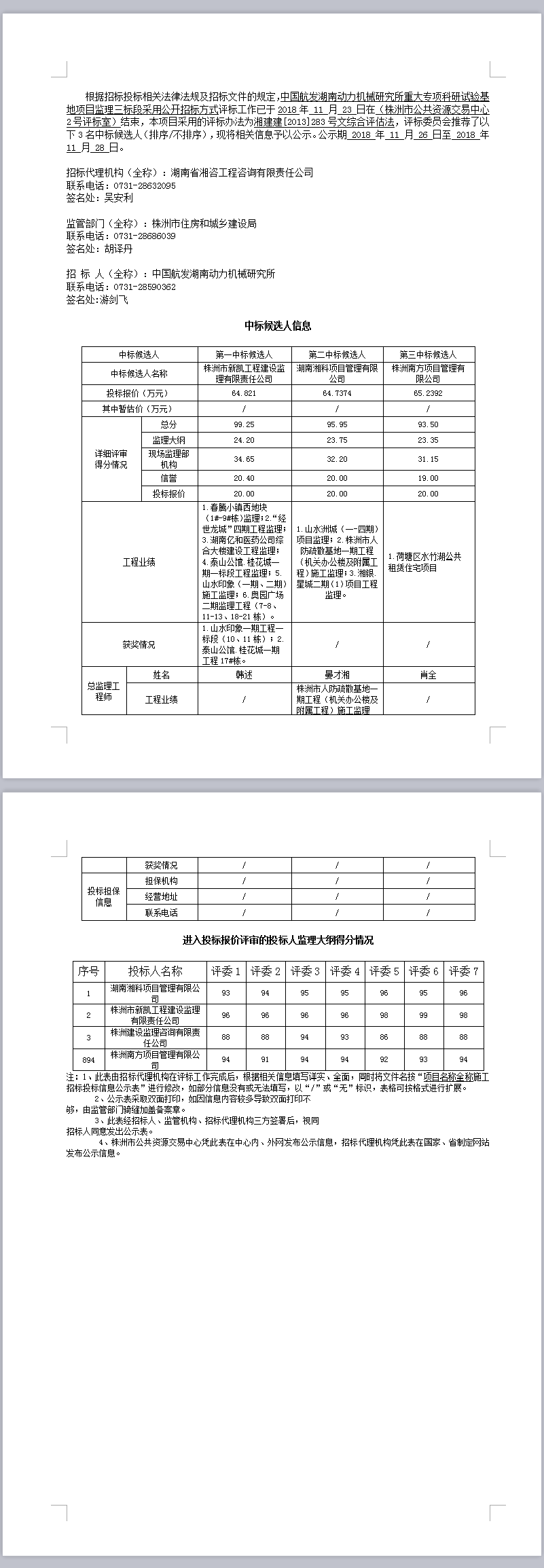 中國航發湖南動力機械研究所重大專項科研試驗基地項目監理三標段招標投標信息公示表