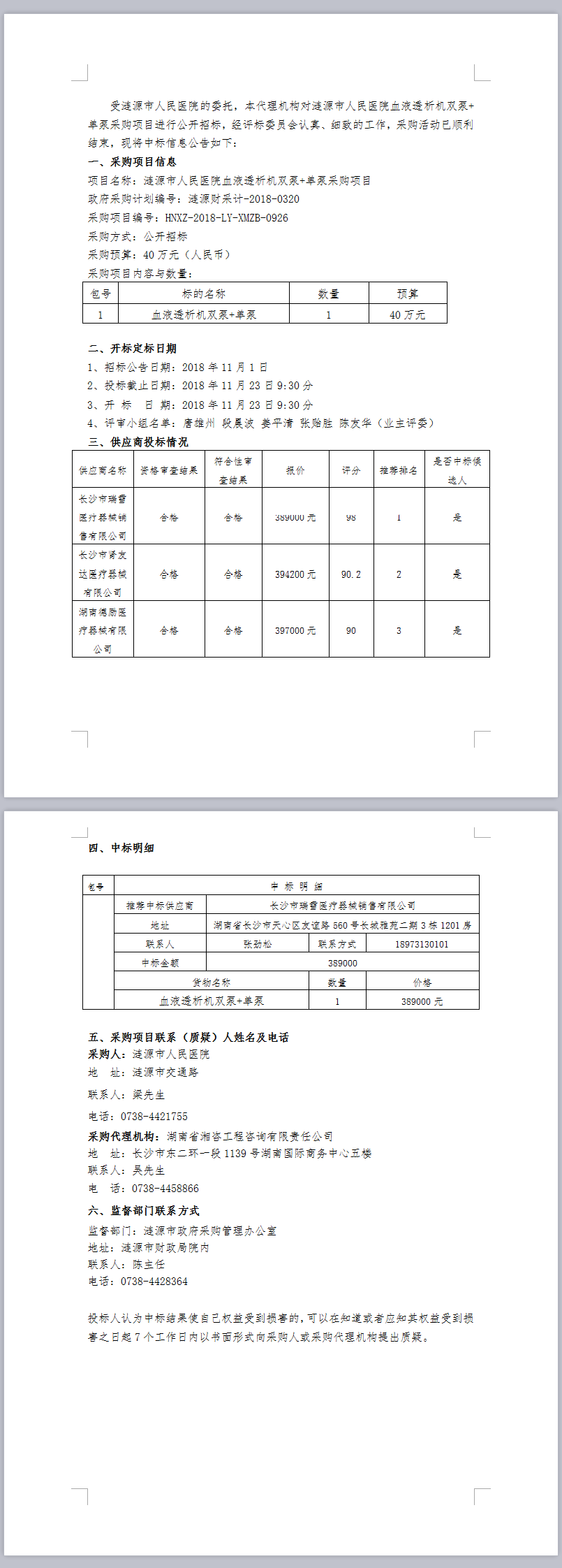 漣源市人民醫(yī)院血液透析機雙泵+單泵采購項目中標結(jié)果公告