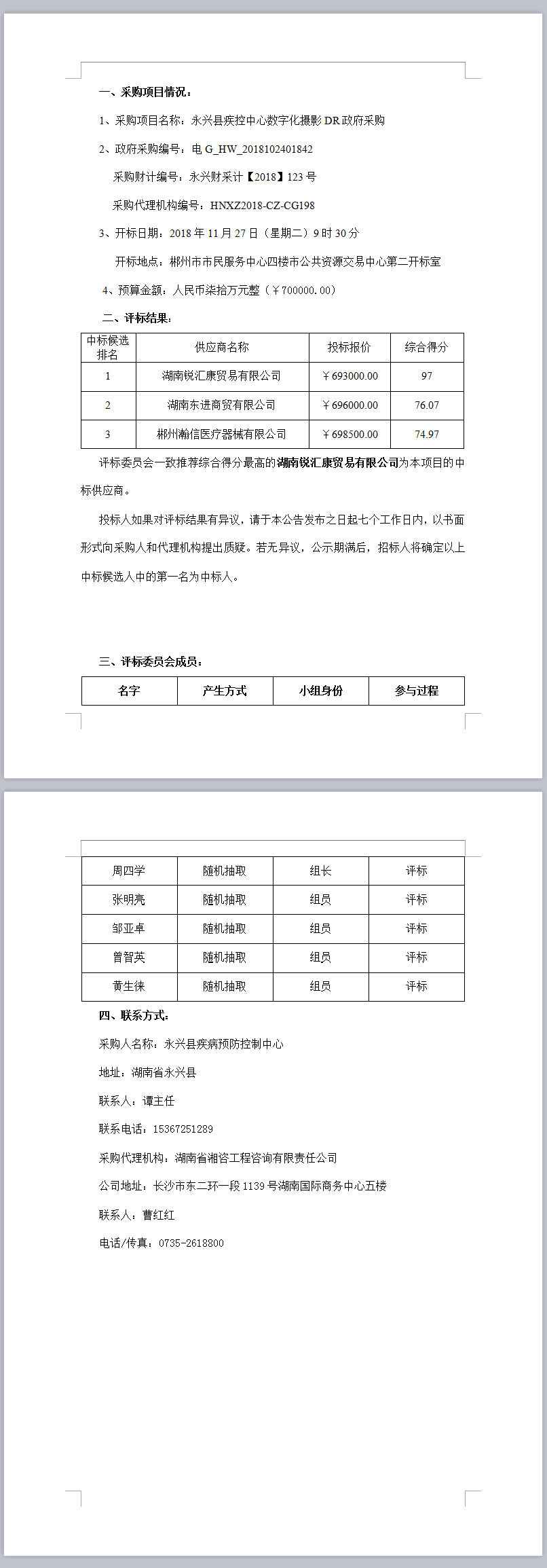 永興縣疾控中心數字化攝影DR政府采購 中標結果公示